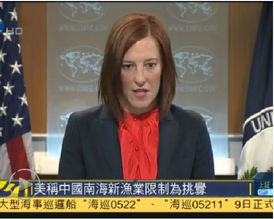 美国国务院发言人普萨基在新闻简报会上表示,针对其他国家在南海有争议区域的渔业活动而通过这些限制,是挑衅并可能造成危险的行为。普萨基表示,中国宣称拥有这广泛海域的主权,但并未提出任何说明或国际法上的根据。海南省去年11月通过新的渔业法办法,自今年1月1号生效,规定外国渔船必须获得许可才能进入海南省所辖海域作业。