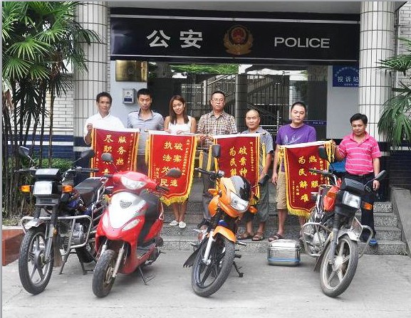 “太感谢你们了!我真没有想到,摩托车丢了不到3天就让你们给我找回来了!”这是11月29日14时许,泸州市江阳区龙透关一小区群众周先生来到泸州市公安局江阳区分局刑侦大队三中队,握着案侦民警的手说出的话,并将一面“办案神速、智擒盗贼”的锦旗送到案侦民警手中。 11月26日下午,江阳区刑侦三中队民警在龙透关紫荆西苑小区内将摩托车盗窃嫌疑人陈勇抓获,缴获一批摩托车,经过查探和寻找,其中有一辆摩托车的是周先生丢失的,三中队民警在第一时间核实后将摩托车退还周先生。
