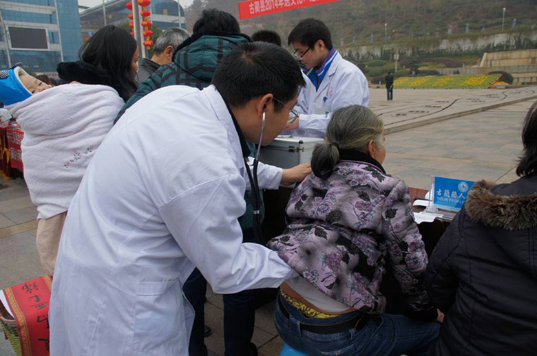 1月27日10点,我们的志愿服务队赶到古蔺县金兰广场,开始了又一场义诊活动。大家服务的热情更加高涨,内科外科医师亲自坐诊,专注的给病人看病开处方,其他同事忙着量血压、测血糖、发放免费药品、讲授健康知识,一直到中午12点。