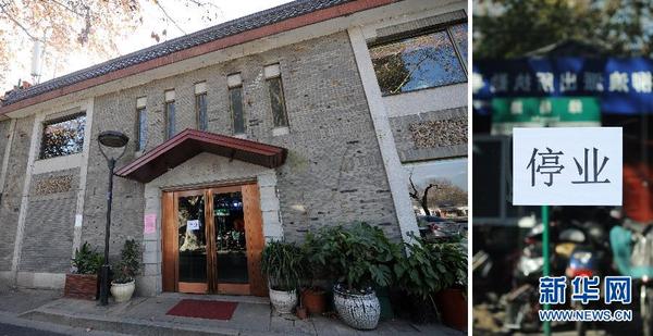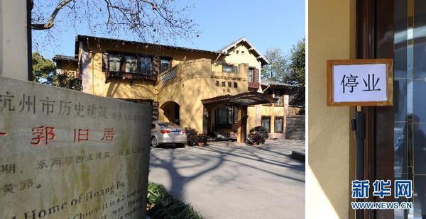 这是1月23日拍摄的第三批关停的位于杭州市西湖边南山路的1917花园餐厅(左图);餐厅门口竖立着“停业”的提示(右图,拼版照片)。