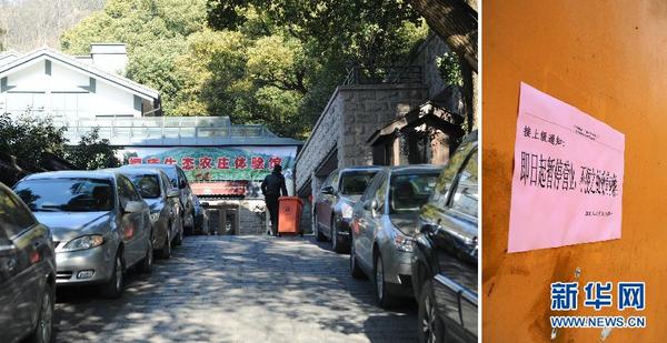 这是1月23日拍摄的于21日关停的位于杭州市西湖边葛岭路的卡森·葛岭庄园(左图);会所入口贴着“暂停营业”的标示(右图,拼版照片)。
