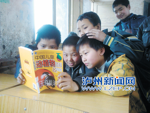 孩子们正在读爱心人士寄来的书籍