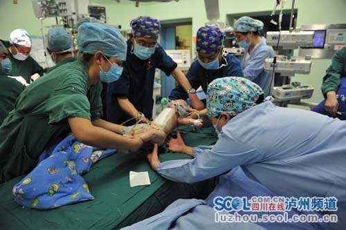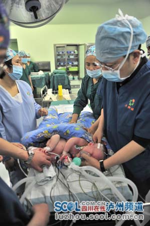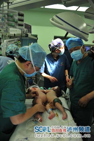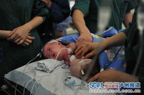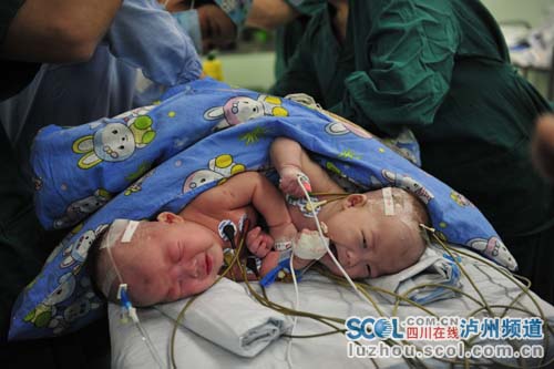 特约记者 蔡惠兰)2013年12月24日,一对连体男婴在泸医附院出生,这是入住泸医附院的第四对连体婴儿。今(25)日上午10:48分,医院为这对连体婴成功进行了分离手术,下午4点,手术团队集中通报手术情况。