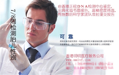另外,虽然抽血鉴别胎儿性别的准确率在98%以上,但仍然有2%左右的失误。记者就此问题与谢女士沟通时,她坦言,如果出现失误,只能是孕妇家庭自认倒霉,“找我也没用啦,因为不是我检测的,报告也不是我出的,要维权你就得到香港找那家检测中心去啦。”