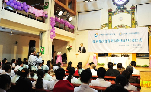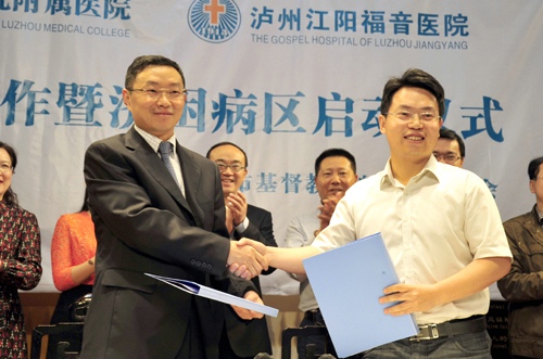 中国经济网泸州5月8日讯(梁婷 记者 初旭)最近,泸州医学院附属医院与泸州江阳福音医院“技术帮扶合作暨济困病区启动仪式”在濂溪路教堂内举行。中国医院协会副秘书长庄一强教授,泸医附院院长何延政教授,泸州市委统战部部长李波,泸医附院党委书记程尧荣、副院长邓存良,泸州市民族宗教事务管理局局长罗素平,江阳区委统战部部长刘秋耘、副部长李阳炜,江阳区卫生局局长侯强、纪委书记罗莉,香港医疗关怀基金苏君煌总裁等参加了揭幕仪式,会议由四川省基督教会副主席、泸州基督教会主席廖晓琴主持。