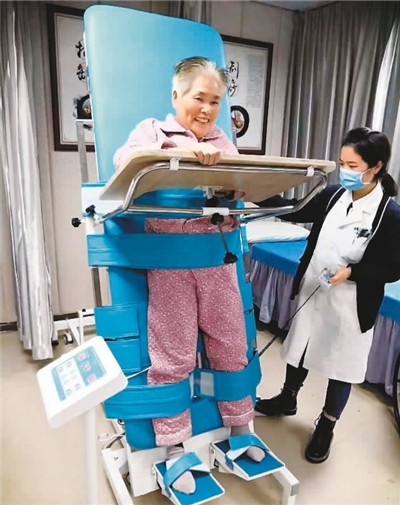 图为西安市碑林区第三爱心护理院老人正在进行站立训练。