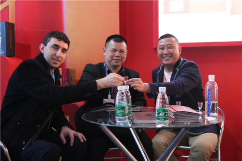 潭酒董事长方久伦(右一)亲临展厅与客商愉快洽谈