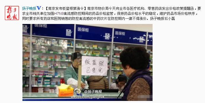 【南京发布板蓝根禁涨令】南京市物价局今天向全市各医疗机构、零售药店发出价格政策提醒函,要求全市相关单位加强H7N9禽流感防控期间的药品价格监管,保持药品价格水平的稳定,维护药品市场价格秩序,同时要求所有药店和医院销售的防控禽流感的中药饮片在防控期内一律不得涨价。扬子晚报 石小磊