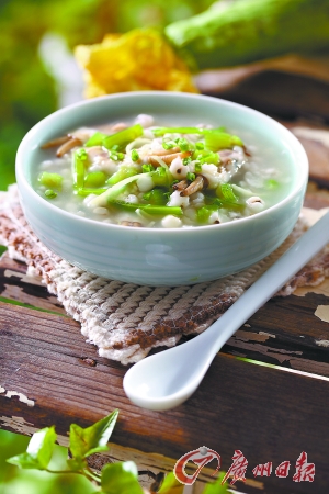 【做法】:将大米淘净后放入砂锅中加入适量清水,大火煮沸,同时将丝瓜刮皮、洗净、切片;煮至大米开花时,放入丝瓜,文火慢熬即可。