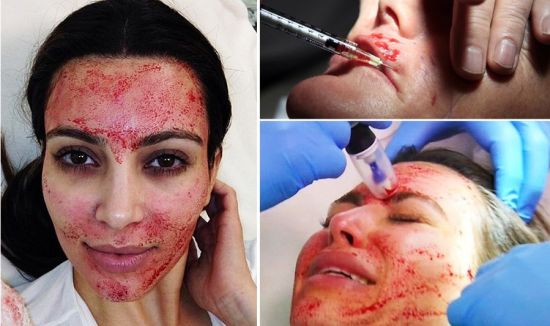示范“吸血鬼美容” 女人为了爱美,真是无所不用其极,连吓死人的“吸血鬼美容”也敢尝试。社交名媛金卡黛珊(Kim Kardashian)就在电视上,亲身示范了这种会让你的脸“血肉馍糊”的最新回春法。所谓“吸血鬼美容”(Vampire facial)是指,将自己的血打入自己脸孔。医生会先帮你抽血,然后把血放进离心机,将血小板除去,提取血浆,重新注射进自己的脸孔,据说可填补改善肌肤瑕疵,如细纹、毛孔及凹洞等问题。