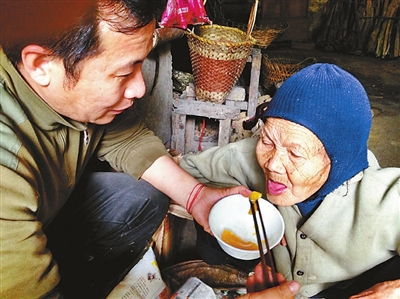 汉达康福协会的吴泽豪喂黄阿婆吃黄桃罐头,黄阿婆十分满足