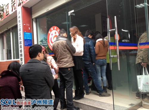 今天,是西方传统的情人节,同时也是中国一年一度的元宵佳节,中西合璧的好日子据说要19年才遇上一回。这样的好日子当然成为新人们选择结婚注册的最佳时机。今日上午,记者在泸州市江阳区民政局的结婚登记处看到,100多对新人已经“挤爆”在大厅门口。