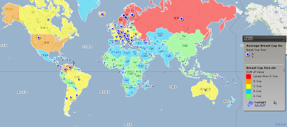 谷歌targetmap清楚地发布了世界各国女性胸部大小信息:俄罗斯最大,中国最小。在这张地图上,红色代表了大于D罩杯,橙色则是D, 黄色是C, 蓝色为B ,而绿色则为A,俄罗斯国土全被“红色”覆盖,代表该国女性胸部平均大于D罩杯。而在包括中国在内的诸多亚洲、非洲国家,则是一片“绿色”,意味着女性平均胸部仅为A罩杯。