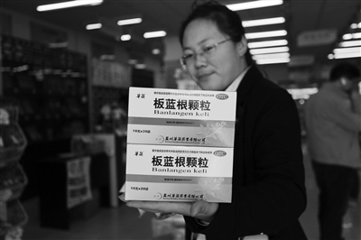 4月4日,在南京鼓楼区一家药店,一名女子在购买板蓝根颗粒。近日,江苏卫生厅发布预防、诊治人感染H7N9禽流感的多个中医方,称板蓝根冲剂、玉屏风散颗粒、黄芪口服液等可用于预防H7N9禽流感。新华社发(韩华摄)